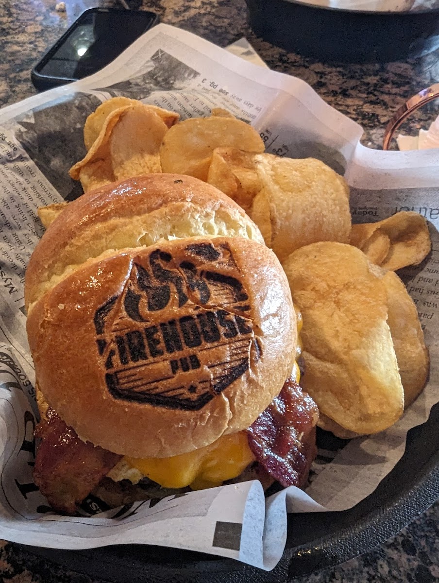 Great spot with good food and service. Grabbed the bbq burger with fried onion rings in it and some garlic Parmesan wings. Both very, very good. Prices are reasonable and the beers are good, they come in 16 oz or 24 oz so be ready. Fries were also very good, crunchy but not dry